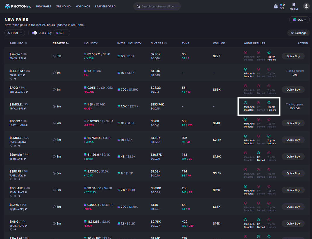 Filter new tokens with your preferences (by volume, marketcap, tx, buy & sell) but above all with audit results, which are very important.